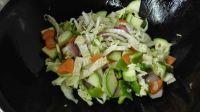 8.再加入娃娃菜、西葫芦、胡萝卜,倒适量酱香酱油一起翻炒