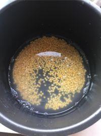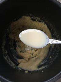 2.压熟的绿豆,用勺子轻轻压成泥,加入炼乳