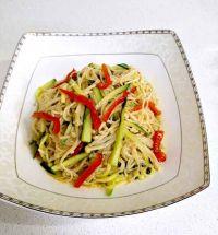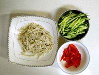 3.金针菇捞出后过凉水沥干;黄瓜切丝,红椒切丝。
