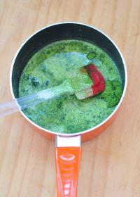 2.筛入抹茶粉和玉米淀粉,在煤气灶上加热,边加热边搅拌,直到液体变浓稠。离火放凉后,过筛一次,放入冰箱冷藏一小时。