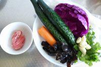3.将黄瓜、紫甘蓝、木耳等食材切丝备用,将大蒜拍碎剁成蒜蓉;