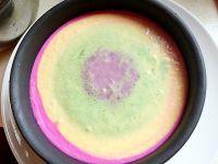 20.再从中心倒入绿色慕斯糊,最后倒入紫色慕斯糊,放入冰箱冷藏过夜