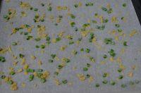 1.在烤盘上撒上葱碎,肉松,火腿肠碎