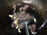 6.大火烧锅至7分热,下丰油,将姜片、蒜片爆香,再下步骤3的牛肉片迅速平铺开,每一面煎制10秒,留尾油,将牛肉片盛出,改中火。