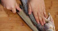 2.处理鲈鱼,鲈鱼头尾各下一刀,从脊背横切取肉,肉切片。鱼骨放入烤箱,180-200度,烤约20分钟