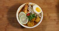 将泡好的米线放入碗中,捞些大虾、鸡蛋等,再淋两勺汤,上面放芽菜、香菜点缀,最后淋半勺鱼露