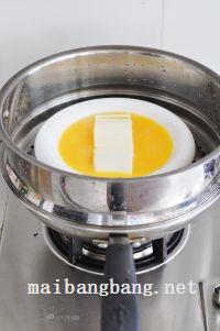 2.豆腐切片码放好。鸡蛋打散,加姜汁少许搅拌彻底,兑等量水搅拌彻底,过筛后倒入盘中。