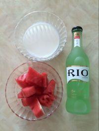 1.将西瓜切成块状,牛奶放入小碗中,准备好鸡尾酒。