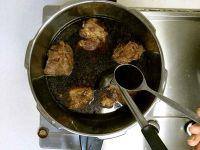 6.把牛肉放高压锅里,放入老汤、少量水、两勺黄酒、三勺老抽、两勺生抽、两勺味极鲜。高压锅耗水少不用放很多。
