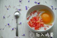 5.5、切好的番茄丁中加入鸡蛋并搅拌。