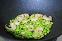 7.等虾仁炒至表面变色时,加入洗干净的青豆一起翻炒
