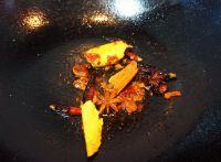 3.开小火,锅中倒适量油,把豆瓣酱、姜、干辣椒、八角和桂皮放进去炒香。