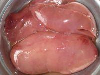 2.猪腰从中间一分为二,片尽去腰臊(白色部分),先打斜刀,注意不要打断了,转个方向,再打直刀,一刀不断,第二刀断开,切好后清水洗干净,然后控干水备用