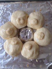3.面团发好后,分成七等份,取六份揉圆摆一圈,中间扣一圆形模具。最后一份做鼻子和耳朵用。