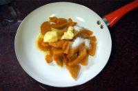 2.称量300克熟南瓜,45克细砂糖,45克黄油,同放入不粘锅中炒馅。