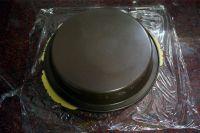 6.在面团上方铺上一片保鲜膜,然后用派盘中心按压面团至扁。