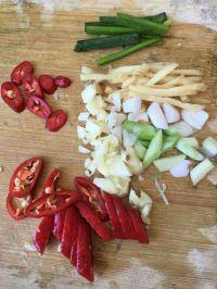 11.依次下姜,然后是蒜和葱白,辣椒干煸