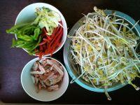 1.准备食材:自发绿豆芽去除根部,大肠是熟的切条