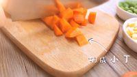 4.放入一个番茄、玉米粒、青豆、火腿粒、胡萝卜粒,加入橄榄油、盐、黑胡椒粉。